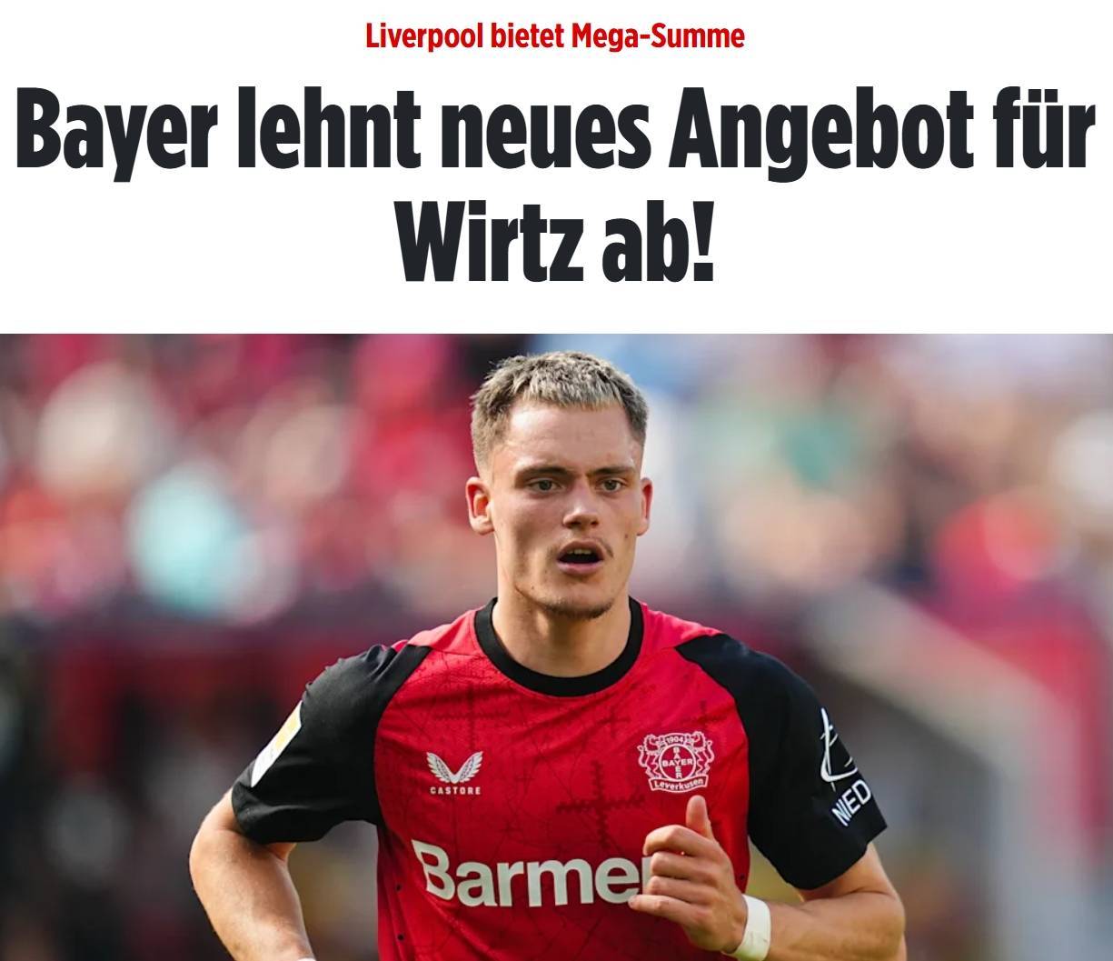 直播吧06月02日讯 德媒《图片报》确认,勒沃库森拒绝了利物浦对维尔茨的第二份报价,总价1.3亿欧元!